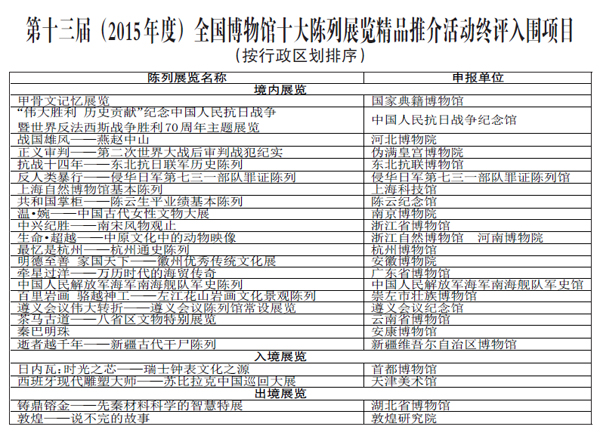 4月7日至9日,第十三届(2015年度)全国博物馆十大陈列展览精品推介初评会在北京召开。由专家库中随机抽选产生的白云涛、冯乃恩、安来顺、李耀申、杨秀娟、张文立、陈开宇、陈克伦、林健、姚安、高春玲、黄乔生、董理、韩永、蔡琴(按姓氏笔画排序)等15位评审专家组成初评评委会,根据《全国博物馆十大陈列展览精品推介办法(试行)》和《关于开展第十三届(2015年度)全国博物馆十大陈列展览精品推介活动的函》的相关要求,对符合参评条件的82个陈列展览项目进行了初评。